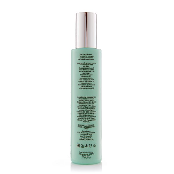 – Масло Макадамії та Сезаму насичує вітамінами, стимулює вироблення колагену та гіалуронової кислоти, надає ліфтинг та детокс-ефект, прибирає бугристість шкіри
